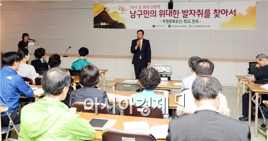 광주 남구(구청장 최영호)는 23일 오전 남구문예회관 전시실에서 지역주민 40여 명을 대상으로 ‘남구민의 발자취를 찾아서’ 라는 주제로 인문학 강의를 개최했다. 사진제공=광주시 남구<br />