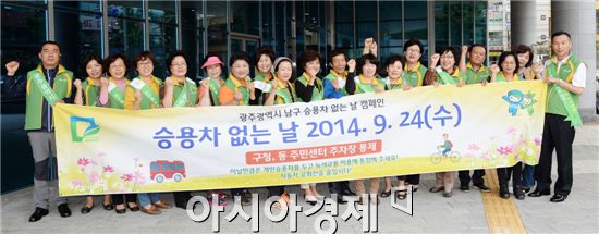 광주 남구(구청장 최영호) 그린리더협의체 회원 50여 명은 ‘승용차 없는 주간’을 맞아 23일 오전 백운광장 일원에서 ‘승용차 없이 하루살기’ 등 대중교통을 이용하여 출근하기 홍보 캠페인을 펼쳤다. 사진제공=광주시 남구<br />