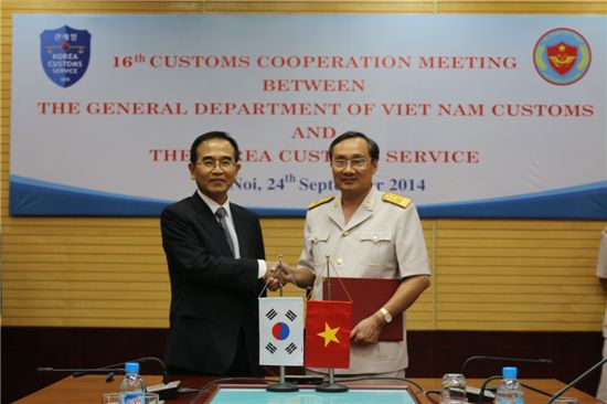 [아시아경제 왕성상 기자] 정부가 베트남에 나가있는 우리 기업들의 현지 통관애로를 덜어주는 등 관세분야 행정지원을 강화한다. 특히 호치민, 빈증, 동나이지역의 우리 기업들이 통관업무를 보는데 걸림돌이 없도록 하는데 업무비중을 높인다. 관세청은 24일 베트남 하노이에서 상호협력 및 교류활성화 등을 위한 ‘제16차 한-베트남 관세청장회의’를 열었다고 25일 밝혔다. 회의에선 ▲베트남에 나가있는 우리기업들의 통관애로 없애기 ▲두 나라 관세청의 인적·기술적 교류 강화 ▲성실무역업체 공인제도(AEO) 협력 ▲불법·부정무역단속 정보공유 활성화방안 등이 중점 논의됐다. 특히 한-베트남 자유무역협정(FTA) 체결을 앞두고 두 나라 교역액이 더 늘 전망이어서 관세당국 협력관계 중요성을 강조하고 우리 기업의 통관애로 해소방안도 다뤘다.베트남 하노이에서 열린 ‘제16차 한-베트남 관세청장 회의’ 때 김낙회(왼쪽) 관세청장과 응웬 옥 뚝(Mr. Nguyen Ngoc Tuc) 베트남 관세청장이 합의록에 서명하고 있다.