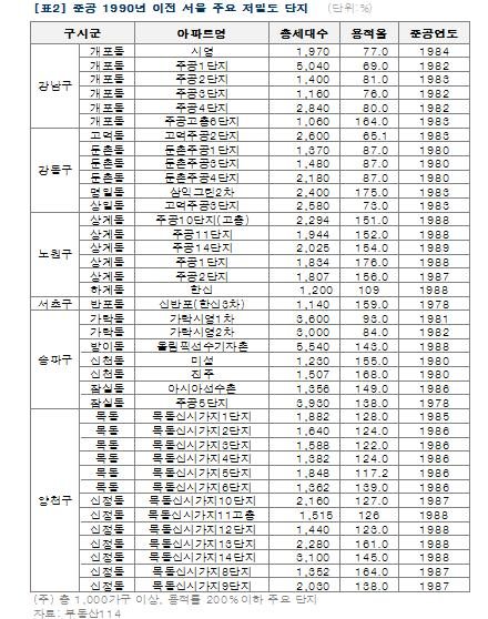 [아시아경제 조인경 기자] 9·1부동산 대책이 발표된 후 재건축 사업에 대한 관심이 높아진 가운데 1990년 이전에 준공한 아파트의 용적률이 비교적 낮아 재건축 사업성이 높은 것으로 조사됐다.25일 부동산114가 전국의 아파트(주상복합 제외)를 대상으로 평균 용적률을 분석한 결과 1990년 이전에 준공된 아파트의 평균 용적률은 192%로 집계됐다.이는 준공 시점이 1991∼2000년인 아파트의 평균 용적률 255%, 2001∼2010년 아파트 222%, 2011∼2014년 아파트 200%와 비교할 때 가장 낮은 수준이다.1980년대 주택 보급률은 낮은 반면 급속한 경제성장으로 주택가격이 급등하자 정부가 1988년 서울올림픽을 기점으로 주택 공급 확대 정책을 편 결과 1990년대 준공 아파트의 평균 용적률이 255%까지 급격히 높아졌기 때문으로 풀이된다.아파트 재건축시 용적률이 낮으면 세대별 대지지분 비율이 높아 추가로 건립하는 아파트가 늘어나고 사업 수익성이 유리한 반면, 용적률이 높은 곳은 동일한 땅에 더 많은 아파트를 지어야 하기 때문에 세대별 대지지분 비율이 낮고 공급되는 아파트 수가 적어 추가분담금 부담이 커지게 된다. 1990년 이전 준공 아파트의 용적률을 지역별로 보면 전북이 141%로 가장 낮고 강원 142%, 전남 144%, 경기 161%, 대구 163%, 인천 176%, 대전 187% 등 순이었다. 서울은 195%로 가장 높았다.서울에서 1990년 이전 준공 아파트 가운데 용적률이 낮은 지역은 관악구(153%), 양천구(161%), 강동구(164%), 강남구(174%), 금천구(179%), 용산구(189%), 송파구(193%), 종로구(195%), 서초구(197%), 강서구(199%) 등의 순으로 조사됐다.부동산114 이미윤 책임연구원은 "정부가 9·1대책을 통해 재건축 가능 연한 축소 등 규제를 완화했지만 지역별로 200∼300%인 용적률 상한선 기준이 여전히 남아있고 재건축시 임대아파트 공급 의무, 기부채납 등 조건도 있는 만큼 재건축을 고려해 노후 아파트를 매입할 때는 사업성을 자세히 따져볼 필요가 있다"고 조언했다.