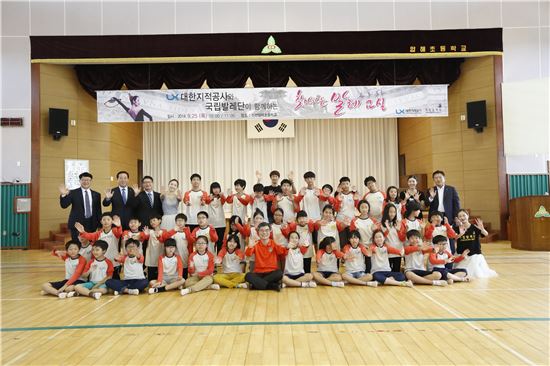 ▲김영표 LX지적공사사장(앞줄 가운데)과 국립발레단이 전남 신안군 압해초등학교 전교생 79명과 '찾아가는 발레교실'을 열고 기념촬영을 하고 있다.