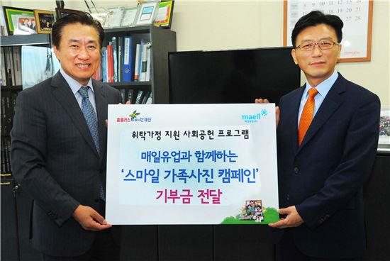 홈플러스와 매일유업이 함께 진행한 '스마일 가족사진 캠페인' 기부금 전달식이 홈플러스 본사에서 열렸다. 좌로부터 설도원 홈플러스 부사장, 조성형 매일유업 부사장
