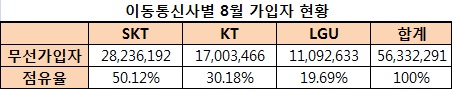 [아시아경제 권용민 기자] 단말기유통구조개선법(단통법) 시행을 앞두고 이동통신시장이 안정세를 이어가면서 5:3:2의 구도는 굳건히 유지되고 있다.26일 미래창조과학부가 발표한 8월 무선통신서비스 통계 현황에 따르면 지난달 이동통신 가입자 수는 5633만2291명으로 전달(5600만4887명)에 비해 32만7404명(0.58%) 늘었다.이통사별로는 SK텔레콤 2823만6192명(50.12%), KT 1700만3466명(30.18%), LG유플러스 1109만2633명(19.69%)으로 집계됐다. SK텔레콤의 시장점유율은 전달 대비 0.03%포인트 상승했고 KT와 LG유플러스는 0.02%포인트, 0.05%포인트 각각 빠졌지만 큰 변화는 없었다.이는 단통법 시행을 앞두고 불법 보조금이 거의 자취를 감춘데다 영업정지 등 정부의 단속 의지에 이통사들이 과감한 고객 유치 활동을 자제하고 있기 때문인 것으로 풀이된다. 지난달 번호이동건수도 하루 평균 1만7432건으로 전달(2만1482건)에 비해 18.8% 줄었다. 방송통신위원회가 판단하는 과열 기준은 2만4000건이다. 권용민 기자 festym@asiae.co.kr<ⓒ세계를 보는 창 경제를 보는 눈, 아시아경제(www.asiae.co.kr) 무단전재 배포금지>