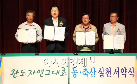 신우철 완도군수(왼쪽에서 두번째)와 과수, 원예, 축산업 각 대표가 완도자연그대로 농·축산 실천 서약을 하고 기념촬영을 하고있다.