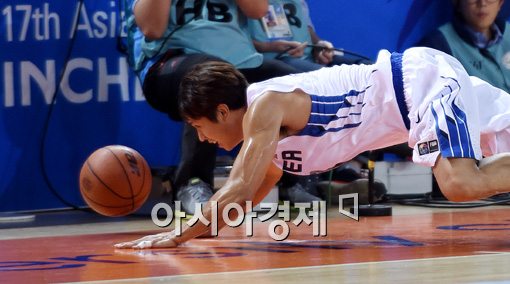 [안산=아시아경제 김현민 기자] 남자 농구 국가대표팀 김태술이 27일 인천 삼산월드체육관에서 열린 아시안게임 필리핀과의 8강 라운드 H조 3경기에서 라인을 벗어나는 공을 살리기 위해 몸을 날리고 있다. 김현민 기자 kimhyun81@asiae.co.kr<ⓒ세계를 보는 창 경제를 보는 눈, 아시아경제(www.asiae.co.kr) 무단전재 배포금지>