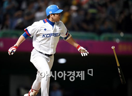 [인천=아시아경제 김현민 기자] 27일 인천 문학야구장에서 열린 제17회 아시안게임 야구 대한민국과 중국의 준결승전, 3회말 1사에서 강정호가 좌월 솔로홈런을 치고 있다.