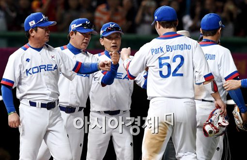[인천=아시아경제 김현민 기자] 야구 국가대표팀이 27일 인천 문학야구장에서 열린 제17회 아시안게임 중국과의 준결승전에서 7-2 승리를 확정짓고 기쁨을 나누고 있다. 김현민 기자 kimhyun81@asiae.co.kr<ⓒ세계를 보는 창 경제를 보는 눈, 아시아경제(www.asiae.co.kr) 무단전재 배포금지>