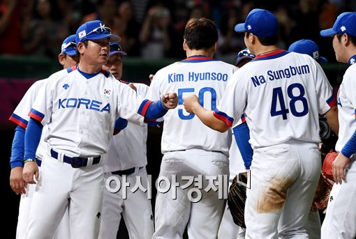 [인천=아시아경제 김현민 기자] 야구 국가대표팀이 27일 인천 문학야구장에서 열린 제17회 아시안게임 중국과의 준결승전에서 7-2 승리를 확정짓고 기쁨을 나누고 있다. 김현민 기자 kimhyun81@asiae.co.kr<ⓒ세계를 보는 창 경제를 보는 눈, 아시아경제(www.asiae.co.kr) 무단전재 배포금지>