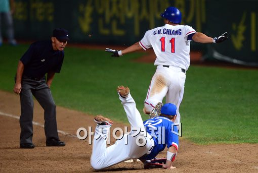 [아시아경제 백소아 기자] 28일 경기도 인천광역시 문학경기장에서 열린 2014 인천 아시아경기대회 남자야구 결승전 한국과 대만의 경기에서 박병호가 대만선수를 아웃시키고 있다.백소아 기자 sharp2046@asiae.co.kr<ⓒ세계를 보는 창 경제를 보는 눈, 아시아경제(www.asiae.co.kr) 무단전재 배포금지>