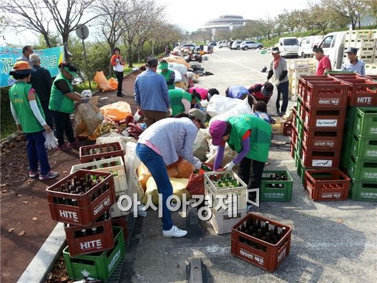 "빈병과 고철, 폐비닐 등 15톤 수거, 500만 원 기금 조성 "[아시아경제 이진택 기자]전남 구례군새마을회(회장 임재신)는 지난 26일 서시천 체육공원 천변주차장에서 새마을지도자, 이장, 부녀회장, 주민 등 200여 명이 참석한 가운데 '숨은 자원 모으기 행사'를 개최했다.마을별로 방치된 빈병과 고철, 폐비닐 등 숨은 자원 15톤을 분리 수거해 주거환경을 깨끗하게 개선하고, 동시에 500만 원의 기금을 조성하는 일거양득의 효과를 거뒀다.특히, 오는 10월에 개최되는 ‘아이언맨70.3 구례코리아 대회’ 및 ‘제26회 전라남도 생활체육대축전’, ‘구곡순담 100세 잔치’, ‘구례동편소리축제’등 대규모 체육 ·문화 행사를 앞두고 손님맞이 청결활동도 함께 실시했다.임재신 회장은 "구례를 찾는 관광객을 위해 앞으로도 꾸준한 환경정화 운동을 펼쳐 ‘자연과 사람이 공존하는 힐링도시 구례’의 이미지를 한층 더 높이는 데 힘을 보태겠다"고 밝혔다.이진택 기자 <ⓒ세계를 보는 창 경제를 보는 눈, 아시아경제(www.asiae.co.kr) 무단전재 배포금지>