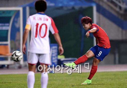 [인천=아시아경제 김현민 기자] 29일 인천 문학경기장에서 열린 아시안게임 축구 여자 대한민국과 북한의 준결승에서 한국 정설빈이 그림같은 오른발 프리킥 골을 성공시키고 있다. 김현민 기자 kimhyun81@asiae.co.kr<ⓒ세계를 보는 창 경제를 보는 눈, 아시아경제(www.asiae.co.kr) 무단전재 배포금지>