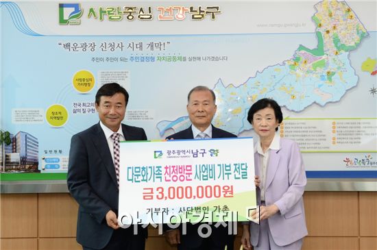 사단법인 가촌 정행웅 이사장이 30일 광주시 남구청을 방문, 다문화가정 친정사업비 300백만 원을 최영호 남구청장에게 전달했다. 사진제공=광주시 남구<br />