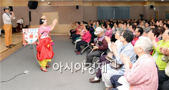 광주 남구(구청장 최영호)는 20일 오전 10시 구청 대회의실에서 관내 어르신 500여 명을 초청해 각설이 공연, 레크레이션, 노래공연 등 노인의 날 맞이 축하공연을 펼쳤다. 사진제공=광주시 남구<br />