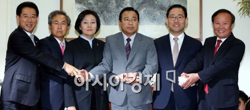 [아시아경제 최우창 기자] 이완구 새누리당 원내대표와 박영선 새정치민주연합 원내대표를 비롯한 양당 원내대표단이 30일 오후 국회 운영위원장실에서 정부조직법과 유병언법 등이 포함된 세월호 특별법 합의 사항을 발표한뒤 손을 잡고 있다.최우창 기자 smicer@asiae.co.kr<ⓒ세계를 보는 창 경제를 보는 눈, 아시아경제(www.asiae.co.kr) 무단전재 배포금지>