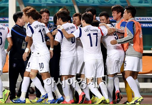 [인천=아시아경제 김현민 기자] 30일 인천 문학경기장에서 열린 아시안게임 축구 남자 한국과 태국의 준결승전에서 이종호가 선제골을 터뜨리고 동료들과 기쁨을 나누고 있다. 김현민 기자 kimhyun81@asiae.co.kr<ⓒ세계를 보는 창 경제를 보는 눈, 아시아경제(www.asiae.co.kr) 무단전재 배포금지>