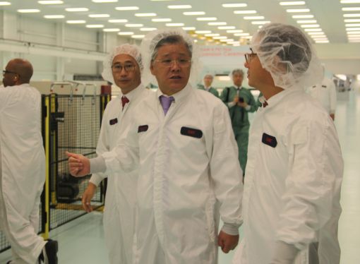 최신원 SKC 회장(가운데)이 30일(현지시간) 미국 SKC Inc. 조지아 공장을 방문, 새로 증설된 PET 라인을 둘러보며 설명을 듣고 있다.