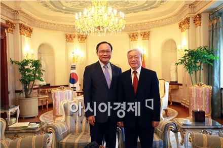 [아시아경제 한진주 기자] 성완종 경남기업 회장이 1일 서울 신라호텔에서 응웬 푸 쫑 베트남 공산당 서기장을 만나 경제협력 방안을 논의했다.응웬 푸 쫑 당 서기장은 베트남에서 권력 서열 1위로 2006년 국회의장을 거쳐 2011년 베트남 공산당 서기장으로 선출됐다. 이번 방문은 지난해 9월 박근혜 대통령의 베트남 국빈 방문에 이은 양국 최고위층 인사 교류 차원에서 이뤄졌다. 쫑 서기장은 성 회장을 만난 자리에서 "베트남 수도 하노이를 상징하는 ‘랜드마크72’을 성공적으로 건립해준 것에 대해 감사드린다"면서 "향후에도 상호간 협력관계를 지속해 나가자"고 말했다.이에 대해 성 회장은 "경남기업이 베트남에서 성공적으로 사업을 수행 온 만큼 향후에도 베트남의 사회·경제 인프라 개발사업에 적극 참여해 베트남 발전에 기여하고 싶다"고 화답했다.경남기업은 지난 1967년 베트남에 첫 진출해 지난 21일에는 베트남 북부 라오까이 성에서 베트남 수도 하노이와 중국 접경지역을 잇는 고속도로를 개통하는 등 현재까지 베트남에서 약 16억달러 규모의 사업을 진행하고 있다. 경남기업이 하노이에 건립한 '랜드마크 72'는 지난해 박근혜 대통령이 베트남에 국빈으로 방문했을 때 한복을 입고 '한복-아오자이 패션쇼'에 참여한 장소로 알려져 있다.한진주 기자 truepearl@asiae.co.kr<ⓒ세계를 보는 창 경제를 보는 눈, 아시아경제(www.asiae.co.kr) 무단전재 배포금지>