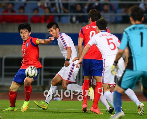 [아시아경제 백소아 기자] 2일 경기도 인천광역시 문학경기장에서 열린 2014 인천 아시아경기대회 남자축구 결승전 한국과 북한의 경기에서 한국 장현수가 골을 시도하고 있다.백소아 기자 sharp2046@asiae.co.kr<ⓒ세계를 보는 창 경제를 보는 눈, 아시아경제(www.asiae.co.kr) 무단전재 배포금지>