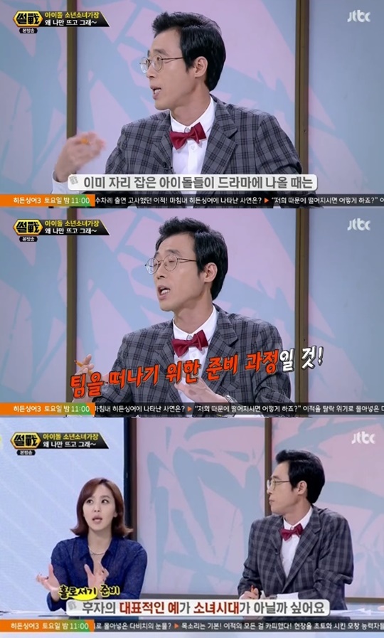 박지윤, 썰전서 제시카 겨냥? "팀 떠나기 위한 준비…대표적 예 소녀시대"[아시아경제 온라인이슈팀] 박지윤이 방송에서 소녀시대를 언급해 시청자들의 눈길을 끌었다.2일 밤 방송된 종합편성채널 JTBC '썰전'의 '예능심판자' 코너에서는 '아이돌 소년소녀가장'이라는 제목 아래 그룹 내 가장 적극적으로 활동하며 팀을 이끄는 아이돌에 대해 다뤘다.이날 출연진은 그룹 내 한명이 뜬 뒤 그룹이 유명세를 얻게 되는 사례를 말하며 노래가 아닌 다른 특기를 가진 멤버를 투입, 활동하는 것이 아이돌이 뜨는 수순으로 자리잡았다고 평가했다.이 가운데 이윤석은 "군소 기획사에서 케이블 드라마에 출연할 때는 팀 전체를 띄우기 위한 사명감으로 시작하는 경우가 많은데 그룹이 뜬 뒤에 이미 자리를 잡은 아이돌이 연기를 하는 경우는 '팀을 떠나기 위한 준비과정'으로 볼 수 있다"고 날카롭게 분석했다.이 말에 박지윤 역시 동의하며 "후자의 대표적인 예가 소녀시대인 것 같다"고 최근 큰 논란을 일으킨 소녀시대를 언급했다.소녀시대는 처음부터 연기로 얼굴을 알렸던 윤아는 물론이고, 서현 수영 제시카 등 많은 멤버들이 연기를 통해 가수가 아닌 다른 장르에서의 활동 가능성을 보여준 바 있다.온라인이슈팀 issue@asiae.co.kr<ⓒ세계를 보는 창 경제를 보는 눈, 아시아경제(www.asiae.co.kr) 무단전재 배포금지>