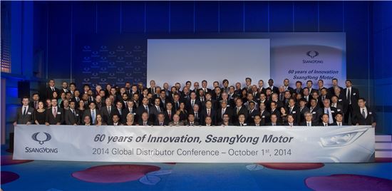 쌍용차 2014년 해외대리점대회 참석자들이 기념촬영을 하는 모습.