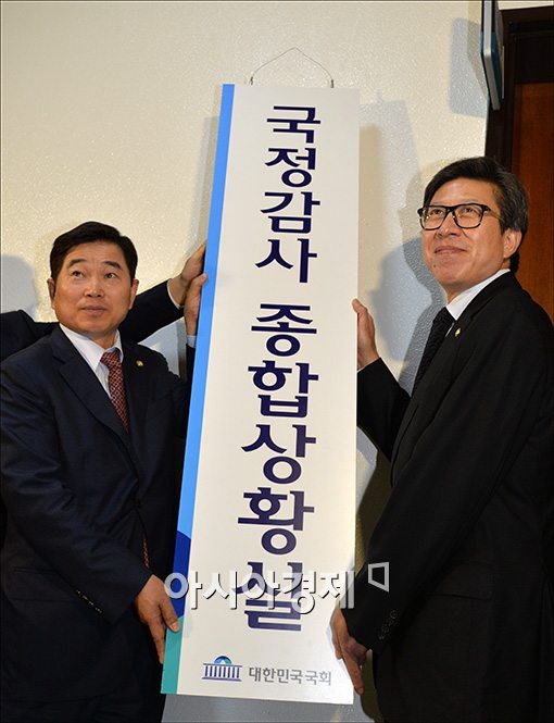 [아시아경제 윤동주 기자] 국정감사를 하루 앞둔 6일 박형준 국회 사무총장(오른쪽)이 종합상황실 현판식을 갖고 있다. 이번 국감은 대상기관이 672곳으로 사상 최대인데 반해 세월호특별법을 둘러싸고 국회 파행에 따른 준비부족으로 시작 전부터 부실국감 우려가 나오고 있다.윤동주 기자 doso7@asiae.co.kr<ⓒ세계를 보는 창 경제를 보는 눈, 아시아경제(www.asiae.co.kr) 무단전재 배포금지>