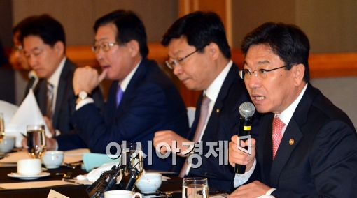 [아시아경제 최우창 기자] 윤상직 산업통상자원부 장관이 6일 서울 서초구 JW메리어트 호텔에서 16개 주요기업 대상으로 열린 '주요기업 투자 간담회'에 참석, 모두발언을 하고 있다. 최우창 기자 smicer@asiae.co.kr<ⓒ세계를 보는 창 경제를 보는 눈, 아시아경제(www.asiae.co.kr) 무단전재 배포금지>