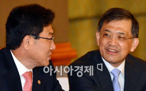 [아시아경제 최우창 기자] 윤상직(오른쪽) 산업통상자원부 장관과 권오현 삼성전자 대표이사(부회장)이 6일 서울 서초구 JW메리어트 호텔에서 16개 주요기업 대상으로 열린 '주요기업 투자 간담회'에 참석, 잠시 대화를 나누고 있다.최우창 기자 smicer@asiae.co.kr<ⓒ세계를 보는 창 경제를 보는 눈, 아시아경제(www.asiae.co.kr) 무단전재 배포금지>