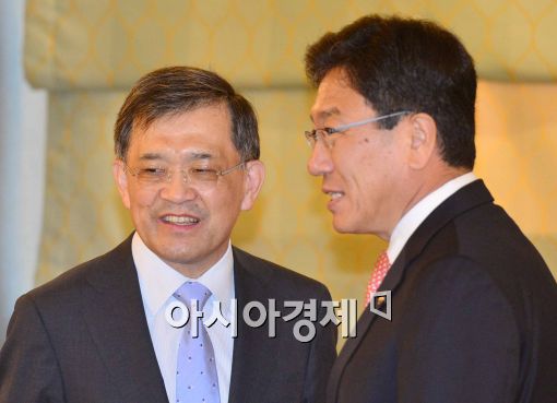[아시아경제 최우창 기자] 윤상직(오른쪽) 산업통상자원부 장관과 권오현 삼성전자 대표이사(부회장)이 6일 서울 서초구 JW메리어트 호텔에서 16개 주요기업 대상으로 열린 '주요기업 투자 간담회'에 참석, 잠시 대화를 나누고 있다.최우창 기자 smicer@asiae.co.kr<ⓒ세계를 보는 창 경제를 보는 눈, 아시아경제(www.asiae.co.kr) 무단전재 배포금지>