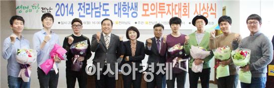 전라남도는 6일 오후 도청 정약용실에서 2014 전남도 대학생 모의투자대회 성적 우수자 8명을 시상하고 기념촬영을 하고있다.