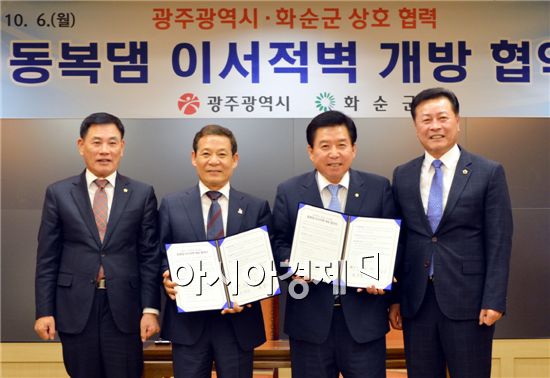 [아시아경제 노해섭 기자]광주광역시와 화순군이 6일 광주·화순의 상생발전을 위한 동복댐 이서적벽 개방을 위한 협약을 체결했다.이날 광주시청 비즈니스룸에서 열린 협약식에는 윤장현 시장, 조영표 시의회의장, 구충곤 화순군수, 이선 화순군의회의장 등 관계자들이 참석했다. 이번 협약에 따라 시는 상수원보호구역 개방, 망향정 주변 안전 펜스 설치, 망향정 시설물 무상관리 위탁 등을 하게 되며. 화순군은 사전예약에 따른 전용차량 운영, 상수원 환경오염 방지 계획 수립, 시설물 안전대책 등 운영 전반을 책임지게 된다.광주시와 화순군은 오는 23일에는 망향정에서 실향민과 거주민의 화합의 장으로 열리는 적벽문화제와 함께 개방 행사를 열 예정이다. 이날 협약식에서 윤 시장은 “광주와 전남은 한 뿌리다.”라며 “이번 협약을 시작으로 앞으로도 광주시와 전남도가 공동발전과 상생을 위한 현안사업에 공동 대응하는 협력관계로 당당히 지역의 미래를 열어 가기를 바란다”고 말했다.구충곤 화순군수는 “화순군은 이번 이서적벽 개방에 머물지 않고 광주와 화순간에 더 아름다운 꽃을 피울 수 있도록 노력하겠다”고 화답했다. 노해섭 기자 nogary@<ⓒ세계를 보는 창 경제를 보는 눈, 아시아경제(www.asiae.co.kr) 무단전재 배포금지>