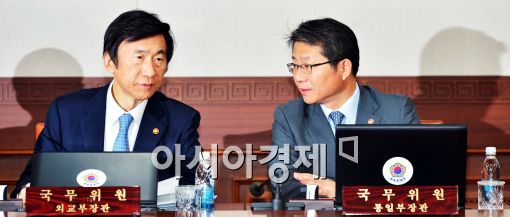 [아시아경제 최우창 기자] 7일 오전 정부서울청사 국무회의장에서 정부세종청사와 정부서울청사 간 영상국무회의가 열린 가운데 참석한 윤병세(왼쪽) 외교부장관과 류길재 통일부장관이 회의 시작 전 잠시 대화를 나누고 있다. 최우창 기자 smicer@asiae.co.kr<ⓒ세계를 보는 창 경제를 보는 눈, 아시아경제(www.asiae.co.kr) 무단전재 배포금지>