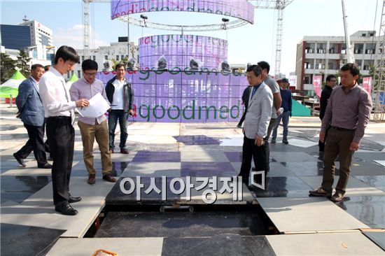 광주광역시 동구(청장 노희용)는 7일 충장축제 개막을 하루 앞 두고 동구청, 동부경찰서, 동부소방서 등으로 구성된 합동점검반을 편성 야외무대 및 전시시설 13개소에 대한 특별 안전점검을 실시했다. 사진제공=광주시 동구<br />