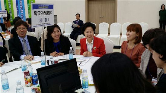 김수영 양천구청장이 학교 안전분과 원탁회의에 참석해 주민들 의견을 듣고 있다.