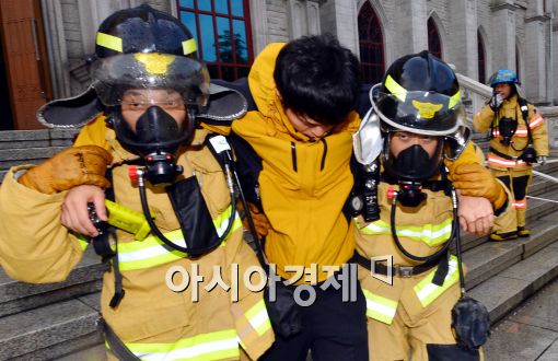 [아시아경제 최우창 기자] 8일 서울 동대문구 회기동 경희대학교 평화의 전당에서 '2014 동대문구 긴급구조 종합훈련'이 열린 가운데 소방대원들이 부상자를 부축하고 있다.최우창 기자 smicer@asiae.co.kr<ⓒ세계를 보는 창 경제를 보는 눈, 아시아경제(www.asiae.co.kr) 무단전재 배포금지>