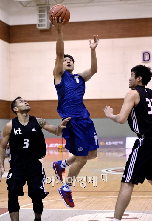 [수원=아시아경제 김현민 기자] 프로농구 전주 KCC 김태술이 8일 경기도 수원시 KT 올레빅토리움에서 열린 부산 KT와의 연습경기에서 상대 전태풍의 수비를 뚫고 공격하고 있다. 김현민 기자 kimhyun81@asiae.co.kr<ⓒ세계를 보는 창 경제를 보는 눈, 아시아경제(www.asiae.co.kr) 무단전재 배포금지>