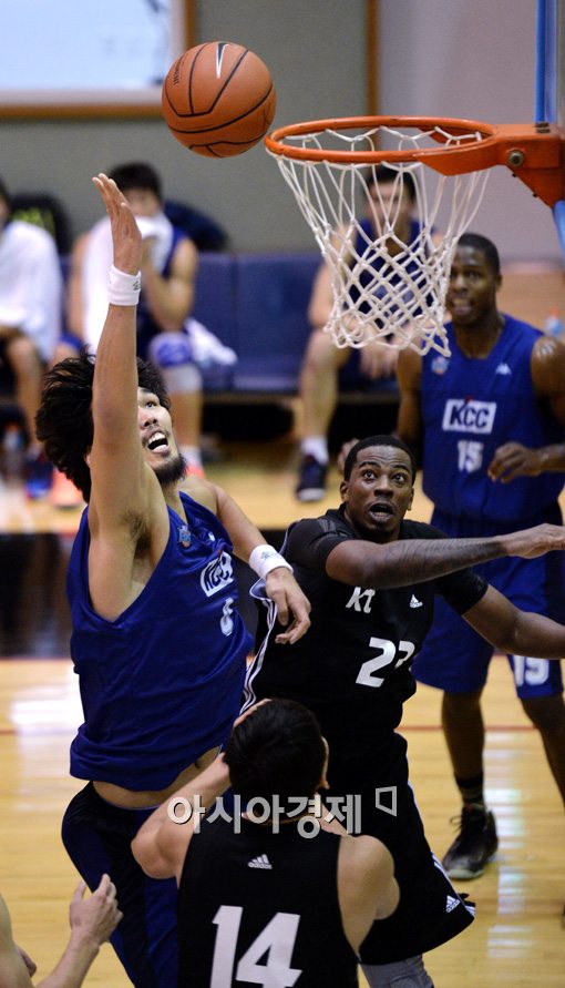 [수원=아시아경제 김현민 기자] 프로농구 전주 KCC 하승진이 8일 경기도 수원시 KT 올레빅토리움에서 열린 부산 KT와의 연습경기에서 상대 로드의 수비를 뚫고 공격하고있다. 김현민 기자 kimhyun81@asiae.co.kr<ⓒ세계를 보는 창 경제를 보는 눈, 아시아경제(www.asiae.co.kr) 무단전재 배포금지>