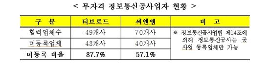 온라인영업점 50%, 사업자등록증 조차 없어84% 온라인영업점, 통신판매업신고 조차 안해 정보통신공사업 무자격업체 통해 유료방송 가설, 설치, A/S까지탈세는 물론 고객 개인정보 불법유통 및 유출 사고 우려 심각 [아시아경제 이초희 기자]일부 케이블방송사들의 무자격 불법 영업행위가 만연해 개인정보 불법유통, 소비자보호 등에 심각한 위험이 있다는 주장이 제기됐다.국회 미래창조과학방송통신위원회 유승희 의원(새정치민주연합, 성북갑)이 7월 기준 온라인을 통해 유료방송 가입자를 유치 중인 사이트, 104개를 임의로 선정해 확인한 결과 사업자등록번호가 없는 업체가 52개(50%), 통신판매업 신고를 하지 않은 업체는 84개(81%)에 달하는 것으로 나타났다.유 의원은 임의 선정된 104개 온라인 사이트 이외에 대다수 인터넷 영업점도 이와 비슷한 것으로 추정했다. 특히, 일부 케이블사업자는 정보통신공사업법을 위반해 무자격 협력사를 통해 방송설비 가설 및 애프터서비스(A/S) 업무 처리의 경우도 확인됐다. 케이블 가입자수 2위인 티브로드는 방문판매 및 기술협력사 전체 49개 중 43개사(88%)가 정보통신공사업자 미등록 불법업체였고 3위 사업자인 씨앤앰도 70개 중 40개 사업자(58%)가 미등록 불법업체로 조사됐다.유 의원은 "케이블방송 가입자 1500만명 시대에 무자격 불법 업체의 영업행위와 방송설비 가설 A/S행위는 그 자체로 충격적이라고 지적했다.그는 이어 "사업자등록조차 안된 50%의 인터넷 영업점은 탈세의 주범이며, 81%의 무자격 통신판매업자의 영업행위는 사기, 부당계약, 고객정보 불법유통 등 각종 범죄행위를 초래할 개연성이 크다"고 주장했다.직접 가입자의 가정을 방문해 방송통신 설비를 설치하고 A/S 해주는 케이블방송사 협력업체의 상당수가 무자격 불법업체라는 것은 가정주부 등 고객의 안전을 직접적으로 위협하는 행위라고 지적했다.유 의원은 "이런 상황을 방치한 미래창조과학부, 방송통신위원회는 심각한 직무유기를 한 것"이라며 "즉각 실태조사를 실시해 무자격 불법 영업과 방송통신 가설, A/S 현황을 파악하고 소비자 보호 조치에 즉각 나서야 할 것"이라고 촉구했다. 이초희 기자 cho77love@asiae.co.kr<ⓒ세계를 보는 창 경제를 보는 눈, 아시아경제(www.asiae.co.kr) 무단전재 배포금지>