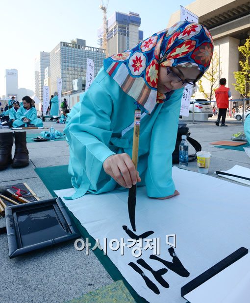[아시아경제 백소아 기자] 제568돌 한글날을 맞은 9일 서울 광화문광장에서 열린 제5회 휘호경진대회에서 이집트 유학생이 서예솜씨를 뽐내고 있다. 이번 휘호대회는 한글의 의미와 가치를 되새기며 인성교육에 기초가 되는 그림과 문자의 소중함을 체험하기 위해 개최되었다.백소아 기자 sharp2046@asiae.co.kr<ⓒ세계를 보는 창 경제를 보는 눈, 아시아경제(www.asiae.co.kr) 무단전재 배포금지>