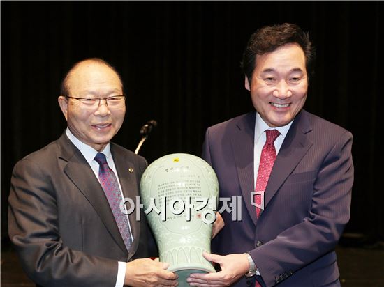 전남도는 이심 대한노인회장을 명예도민으로 선정하고 이낙연 도지사(오른쪽)가 도민패를 전달하고있다.