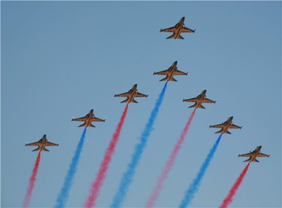 [아시아경제 백종민 기자] 9일 수원시 공군비행장에서 개막된 '공군과 함께하는 2014 경기항공전'에서 공군 블랙이글팀이 화려한 연기를 뿜으며 날아오르고 있다.