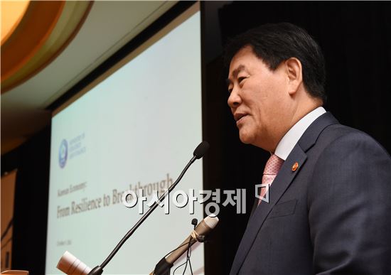[뉴욕(미국)=아시아경제 조슬기나 기자] "한국의 재정건전성은 세계 최고 수준이다. 한국 정부의 야심찬 개혁을 통해 (여러분들도) 또 다른 성공 스토리를 만들길 바란다." 글로벌 금융·경제 중심지인 미국 뉴욕에서 9일(현지시간) 한국 세일즈에 나선 최경환 경제부총리 겸 기획재정부 장관의 목소리에는 내내 자신감이 넘쳤다.이날 미국 뉴욕 포시즌스호텔에서 열린 한국 경제 설명회에 참석한 최 부총리는 한국 경제에 관심 있는 해외투자자 및 글로벌 금융회사 주요 인사를 대상으로 확장적 재정정책을 포함한 이른바 '최경환 노믹스'를 소개했다. 당초 100여명 정도 참석할 것으로 예상됐던 설명회에는 세계 최대 사모펀드 운용사인 블랙스톤의 스티븐 슈워츠먼 회장과 뱅크오브아메리카 메릴린치의 주식부문 글로벌 대표, 시티그룹의 자본시장부문 부회장 등 거물급 인사를 비롯해 200여명이 몰려 성황을 이뤘다. 미처 입장하지 못한 투자자들은 기재부가 급히 마련한 별도의 공간에서 화면을 통해 설명회에 참석했다. 팸플릿 역시 동이 나 복사물로 대신했다.'한국 경제: 회복에서 도약으로(Korean Economy:From Resilience to Breakthrough)'라는 다소 과감한 발표주제는 한국 경제가 세계 경제 회복과 도약에 선도적 역할을 하겠다는 정부의 강한 의지를 그대로 보여준다.그간 설명회가 한국 경제의 견실함을 강조하는 소극적 내용에 그친 반면 이번에는 이를 바탕으로 한국이 가장 먼저 저성장기조를 타파하겠다는 적극적 메시지가 담긴 것이 가장 큰 차이다.최 부총리는 넬슨 만델라의 '높은 언덕을 오른 후에 올라야 할 더 많은 언덕이 있다는 것을 발견한다'는 말을 인용해 글로벌 경제위기에 대해 언급한 후, "한국은 세계 경제의 국면전환기마다 가장 발 빠르게 적응해왔다"며 "한국이 과감하고 적극적 정책을 통해 누구보다 빨리 축소균형의 함정을 돌파하는 선도 주자가 될 것"이라고 강조했다. 구체적으로는 41조원 이상의 자금을 투입하는 등 확장적 거시정책을 포함해 가계소득 증대세제 3대 패키지와 노동시장 개혁, 청년·여성 일자리 창출, 규제개혁을 상세히 소개했다. 이를 통해 올해 3.7%, 내년 4.0%의 경제성장률을 달성하겠다는 목표다. 그는 "저성장 극복을 위해 지금이 확장적 정책을 실시할 때라는 확신이 있었다"며 "한국 정부의 야심찬 이번 개혁을 통해 또 다른 성공스토리를 만들길 바란다"고 당부했다. C|02이날 20분간에 걸쳐 직접 영어로 한국 경제의 상황과 정부 방침에 대해 프레젠테이션한 최 부총리는 이후 이어진 투자자들의 질문에도 막힘없이 답변했다. 특히 최 부총리는 한국의 재정건전성 등에 강한 자신감을 내비쳤다. 최 부총리는 "미국의 금리인상을 조기에 한다 해도 한국에서 급격한 자본유출은 일어나지 않을 것"이라며 "한국의 재정건전성은 세계 최고 수준"이라고 말했다. 그는 3600억달러 이상의 충분한 외환보유고, 낮은 단기외채 비중, 30개월 이상 지속되는 경상수지흑자 등을 근거로 언급하며 "작년 5월 미국이 양적완화 가능성을 제시한 후 일 년 이상 다른 신흥국과 차별화된 모습을 보이고 있다"고 덧붙였다.또한 "한국의 확장적 재정정책은 경제 주체들의 위기를 일신하기 위한 마중물 역할을 하는 보완책"이라며 미국 등 선진국의 양적완화 정책과 선을 그었다. 그는 "선진국의 양적완화 정책은 통화팽창을 통해 환율절하 거쳐서 낙수효과를 기대한 정책이었다면 한국은 기본적으로 가계 등 소득을 늘려 선순환구조로 만들고 경기활성화를 위한 시스템 개혁에 중점을 두고 있다"며 "재정건전성도 충분히 확보하고 있고 상대적으로 높은 수준의 금리를 유지하고 있다"고 언급했다.가계부채 문제가 한국 경제의 시스템 리스크로 적용될 가능성은 적다고 봤다. 최 부총리는 "LTV, DTI와 관련한 규제합리화로 인해 가계부채의 양 자체는 다소 증가할 수 있겠지만, 정부가 비율 자체를 총량적으로 관리하겠다는 목표를 세웠다"며 "질적 구조는 오히려 나아지고 있다"고 일각의 우려에 대해 반박했다. 그는 "총량과 함께 질을 개선하고, 가처분소득에서 분모인 수입을 늘림으로써 가계부채 비율을 낮춰서 관리하겠다"며 가계부채 관리를 위한 투트랙 전략도 소개했다.세법개정안에 포함한 기업소득환류세제 등을 통해 외국인 투자가들의 장기투자가 늘어날 것이라는 기대감도 표했다. 그는 "배당기업의 연기금 등 주주권 행사 제약비율을 해소하면 외국인 투자자들도 포함될 것"이라며 "우리나라 주식이 낮은 배당 때문에 저평가된 측면이 있는데, 주식가치가 높아지며 외국인 투자가들 입장에서도 안정적인 장기투자수요가 생길 것"이라고 내다봤다.중국의 경제성장 둔화, 엔저가 한국 경제에 미칠 악영향에 대해서는 "소비재 수출, 중국 내수 등으로 중국 진출을 강화함으로써 대중수출을 유지해나가겠다"며 "현재까지는 엔저효과가 제한적이지만 장기화되고 심화되면 우리나라를 비롯해 중국, 미국에도 영향을 미칠 것"이라고 답변했다. 새 경제팀은 이에 앞서 8일 경제관계장관회의에서 엔저 대책을 확정했다.아울러 최 부총리는 투자자들이 한국 투자에 앞서 늘 우려를 표하는 북한 변수에 대