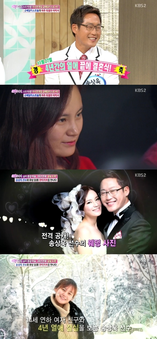 '승마 금메달리스트' 송상욱, 14살 연하 미모의 여친과 4년 열애…11월 결혼[아시아경제 온라인이슈팀]승마 금메달리스트 송상욱 선수가 14살 연하 예비 신부와 오는 11월 결혼식을 올린다고 밝혔다.10일 오전 방송된 KBS2 '여유만만'에는 ‘2014 인천 아시안게임 금메달리스트 4인방’ 국가대표 승마의 송상욱, 양궁의 최보민, 사격의 김민지, 우슈의 이하성 선수가 출연해 다양한 이야기를 나눴다. 송상욱 선수는 "여자친구는 처음에 취미로 승마를 시작했다. 소속팀의 인턴사원으로 들어와서 인연을 맺게 됐다"고 말문을 열었다. 이어 송상욱 선수는 "관심이 있었지만 나이차이 때문에 가까이 가지 못하다가 서로의 마음을 확인하고 발전하게 됐다. 예비 장인 장모님도 처음에는 반대를 하셨는데 결국은 결혼 승낙을 받았다"고 만남의 과정을 설명했다.또 송상욱 선수는 14살 차의 아름다운 예비신부와 찍은 웨딩 사진을 공개하며 4년간의 열애 끝에 11월 결혼에 골인한다고 밝혔다.송상욱 선수 결혼 소식을 접한 네티즌들은 "송상욱, 14살 연하라니 나이 차 꽤 나네", "송상욱, 서태지-이은성 부부도 그렇고 요즘은 어린 신부가 많네", "송상욱, 금메달에 이어 겹경사 축하합니다", "송상욱, 예쁘게 잘 사세요" 등의 다양한 반응을 보였다.온라인이슈팀 issue@asiae.co.kr<ⓒ세계를 보는 창 경제를 보는 눈, 아시아경제(www.asiae.co.kr) 무단전재 배포금지>