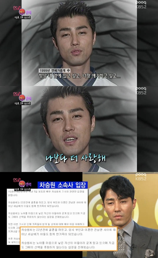 '연중' 차승원 과거 인터뷰 영상 '뭉클'…"나보다 널 더 사랑해"[아시아경제 온라인이슈팀] 배우 차승원이 친부 소송 논란에 휩싸인 가운데, 아들을 향한 마음을 엿볼 수 있는 과거 인터뷰 영상이 소개돼 화제다. 11일 방송된 KBS 2 '연예가중계'에서는 차승원의 친부 소송 사건에 대해 소개했다.이날 방송 중에는 지난 1999년 차승원이 '연예가중계' 측과 진행했던 인터뷰 영상이 공개됐다. 당시 차승원은 아들을 향해 "항상 네 옆에 있고 싶고, 너랑 얘기하고 싶고, 너랑 놀고 싶다. 나보다 널 더 사랑한다"는 뭉클한 영상 편지를 보냈다. 차승원과 부인 이수진 씨는 최근 아들 차노아의 친부인 조모씨로부터 1억원 상당을 요구하는 손해배상 소송을 당했다. 이와 관련해 차승원 소속사 YG엔터테인먼트는 지난 6일 오후 보도자료를 통해 "차승원 씨는 22년 전에 결혼을 하였고, 당시 부인과 이혼한 전남편 사이에 태어난 세살배기 아들도 함께 한가족이 되었습니다"라고 해명하며 차노아가 차승원의 친아들이 아니라는 사실을 밝혔다. 이어 "차승원 씨는 노아를 마음으로 낳은 자신의 아들이라 굳게 믿고 있으며 지금도 그때의 선택을 후회하지 않는다는 입장을 전해왔습니다"라고 공식입장을 알렸다. 이후 조 씨는 지난 7일 법률대리인을 통해 서울중앙지법에 소취하서를 제출했고, 이에 조 씨가 차승원과 부인 이수진 씨를 상대로 제기했던 손해배상소송도 일단락됐다. 온라인이슈팀 issue@asiae.co.kr<ⓒ세계를 보는 창 경제를 보는 눈, 아시아경제(www.asiae.co.kr) 무단전재 배포금지>