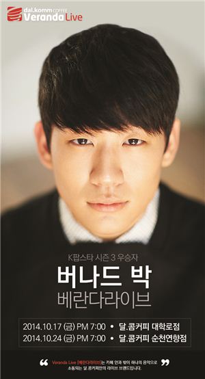 [아시아경제 김소연 기자]커피프랜차이즈 달콤커피(dal.komm COFFEE)가 가을 정취와 어울리는 감성보컬 ‘버나드 박’의 베란다 라이브(Veranda Live) 콘서트를 개최한다고 15일 밝혔다. 강영석 달콤커피 기획팀 팀장은 “버나드 박은 K팝스타 시즌3 우승자로 이번 라이브 콘서트에서 데뷔앨범 ‘난…’의 타이틀곡 ‘Before the Rain(비포더레인)’을 팬들에게 선사할 예정”이라며 “이외에도 앨범 수록곡을 비롯한 감미로운 가을 발라드와 애틋한 보이스의 R&B 음악을 팬들에게 들려줄 것”이라고 말했다. 달콤커피 라이브 무대를 꾸며줄 ‘버나드 박’의 타이틀곡 ‘Before the Rain(비포더레인)’은 작곡가 조규찬이 버나드 박의 목소리가 자연스럽게 흐르도록 작업한 여백과 쉼이 있는 잔잔한 곡으로 음원공개와 함께 음원차트를 발라드로 물들이는 등 감성 발라드의 흥행을 예고하고 있다. 버나드 박의 라이브 콘서트는 오는 17일 달콤커피 대학로점과 24일 달콤커피 순천 연향점에서 각각 오후 7시에 개최될 예정이며, 콘서트 당일 해당매장에서 음료 구매후 선착순으로 배포하는 번호표를 소지한 팬들은 무료로 콘서트에 입장할 수 있다. 달콤커피의 베란다 라이브 콘서트는 매월 역량있는 가수들을 아티스트로 선정하고, 전국 가맹점에 초대해 무료로 라이브 무대를 선사하는 달콤커피만의 특화된 프로모션으로 최근 주니엘, 홍대광, 박시환, 15&를 비롯한 스타들이 함께했으며, 팬들과 소통하는 미니 라이브 콘서트로 해마다 인기를 더해가고 있다. 김소연 기자 nicksy@asiae.co.kr<ⓒ세계를 보는 창 경제를 보는 눈, 아시아경제(www.asiae.co.kr) 무단전재 배포금지>
