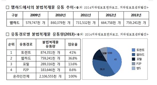 1개 사이트에 시간당 200여건의 음란물이 올라와 웹하드는 거대한 포르노 사이트‘웹하드 등록제’ 이후에도 계속되는 침해, 저작권자들 강경 대응 준비[아시아경제 이초희 기자]'웹하드 등록제' 시행으로 잦아들던 웹하드에서의 불법 정보의 유통이 다시 사회적 문제가 되고 있다. 특히, 음란물의 유통은 심각한 수준이라는 지적이다. 개인이 휴대폰 등으로 촬영한 영상이 무차별적으로 유포되면서 음란물 속 등장인물의 개인정보까지 파헤쳐지는 등 문제가 심각하게 확산되는 추세다. 16일 저작권문화발전연구소에 따르면 국내 최대 웹하드 위디스크에 게시되는 음란물 수는 평일 평균 하루 5100여건, 8500기가바이트(GB)에 이르는 음란물이 올라왔다. 시간 당 200건이 넘는 음란물이 평일 낮에 게시되고 있는 것이다. 주말동안 올라온 음란물은 11만건이 넘어가 수를 집계할 수 없을 정도다. 이를 100여개에 이르는 웹하드 전체로 확대해서 생각하면 '음란물 천국'이라는 웹하드의 현실을 실감케 한다는 지적이다 개인 촬영 음란물 영상은 특히 문제로 꼽혔다. 실제로 국산 개인 음란물 영상이 올라오면 네티즌들은 집요하게 영상 속 인물을 추적해 끝내 이름, 나이, 학교 등을 밝혀내고 이를 영상과 함께 다시 웹하드에 게시한다. 그야말로 개인에 대한 인격살해가 자행되고 있는 것이다. 웹하드에서의 저작권 침해 불법복제물의 유통도 여전히 심각한 상태로 나타났다. 웹하드 업체들의 불법 콘텐츠 및 유해정보 유통이 성행하는 것을 막기 위해 2011년 11월부터 시행한 웹하드 등록제 시행 이후 많은 웹하드 사이트들이 사라졌으나 등록된 사이트에서도 더욱 은밀한 형태로 불법복제물들이 유통되고 있다. 웹하드 등록제의 핵심 사항 중 하나는 콘텐츠 보호를 위해 기술적 보호조치를 취하는 것에 있다. 그러나 웹하드는 저작권자가 요청하는 기술적 보호 조치를 우회하거나 일정시간 개방하는 등의 방법으로 불법적인 콘텐츠 유통을 조장하고 있다는 지적이다. 실제 웹하드에서의 5년 동안의 불법복제물 유통 건수 추이를 보면, 2013년은 7억6000만개로 웹하드 등록제 시행 전인 2011년 7억3000만개보다 3000만 개나 증가했다. 또한 2013년 유통경로별 불법복제물 유통량을 봐도 2012년과 똑같이 토렌트(41%)와 웹하드(37%)가 양분하고 있는 실정이다. 또한 모바일로 유통 채널이 확장되면서 발생하는 문제들에 대해서 효과적인 대처방인이 마련되지 않고 있다는 점이 문제점으로 지적된다. 제휴 콘텐츠를 모바일 버전에서 비제휴로 하는 등 기술적 조치에 한계가 있는 점을 활용한다. 웹하드는 모바일 서비스까지 하면서 불법 콘텐츠 유통의 시작과 끝 모두를 담당하고 있는 것이다. 이처럼 웹하드의 음란물이든 불법 콘텐츠든 올라오는 양이 엄청난 이유는 웹하드와 계약한 헤비업로더의 역할이 크다는 것이 웹하드 업계에서의 공공연한 비밀이라고 연구소는 밝혔다. 최근 몇몇 대표 웹하드 업체가 '매출 누락', '헤비업로더 고용' '불법 업로드 업체 운영' 등으로 처벌 받은 사례에서도 확인 할 수 있다. 그러나 여전히 처벌은 솜방망이고 이와 같은 불법적인 행태는 지금도 계속되고 있다. 실제로 웹하드의 이러한 불법적인 행태는 이번 국정감사에서도 문제가 되었으며, 웹하드의 음란물 범람의 원인 및 웹하드 업체와 필터링 서비스 제공업체와의 관계를 조사해 볼 필요가 있다고 지적됐다. 이초희 기자 cho77love@asiae.co.kr<ⓒ세계를 보는 창 경제를 보는 눈, 아시아경제(www.asiae.co.kr) 무단전재 배포금지>