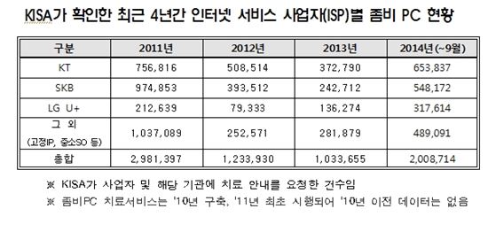 2011년 디도스 대란이후 감소추세 좀비 PC 올해들어 대폭증가전병헌 의원 “사이버 보안에 대한 경각심 항상 필요” [아시아경제 이초희 기자]좀비PC가 올 들어 지난해보다 2배 이상 증가한 것으로 나타났다.국회 미래창조과학방송통신위원회 소속 전병헌 의원(새정치민주연합)이 16일 인터넷진흥원으로부터 제출받은 '최근 4년간 좀비PC현황' 자료에 따르면 올 들어 좀비PC가 전년대비 2배 이상 증가한 것으로 나타났다. 이는 2011년 3.4디도스 대란과 좀비PC 치료 안내가 시행되면서 감소추세를 보였다 크게 반전된 것이다.좀비PC 추이를 보면 2011년 첫 제도시행과 함께 298만대로 최고 수치를 기록한 이후 2012년 123만대, 2013년 103만대로 점차 감소세였다. 그러나 지난 9월까지 총 200만대의 좀비PC가 발생해 이미 2013년 대비 2배 증가했고, 연말까지 약 230만대 가량의 좀비PC가 발생할 것으로 전망됐다. 2011년 3.4디도스 대란이 있었다는 점을 감안하면 올해 들어 대폭 늘어난 좀비PC는 또 다른 디도스 대란을 걱정해야 한다는 것이 전 의원의 주장이다.전병헌 의원은 "항상 사이버 보안 대한 경각심을 가져야 한다. 일상의 대부분의 인터넷 모바일과 연결돼 있고 생활의 일부분의 됐다는 점을 감안하면 사이버 보안은 일상생활의 생활 안전 치안과 동일한 개념이 돼버렸다"며 "정부도 사이버 보안정책에 대한 관심과 기술력을 높여야 할 때"라고 말했다.이초희 기자 cho77love@asiae.co.kr<ⓒ세계를 보는 창 경제를 보는 눈, 아시아경제(www.asiae.co.kr) 무단전재 배포금지>
