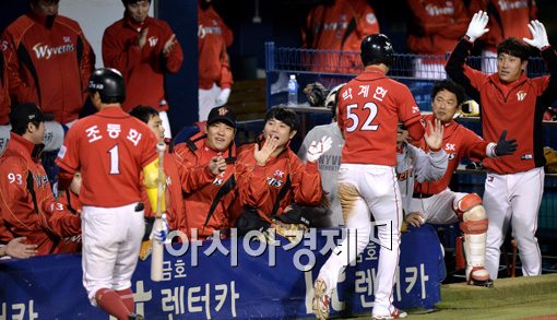 [아시아경제 김현민 기자] 프로야구 SK 와이번스와 두산 베어스의 경기가 16일 서울 잠실구장에서 열렸다. 연장 10회초 무사 2,3루에서 SK 조동화의 역전 1타점 우익수 희생플라이 때 3루주자 박계현이 득점에 성공하고 동료들의 환영을 받고 있다. 김현민 기자 kimhyun81@asiae.co.kr<ⓒ세계를 보는 창 경제를 보는 눈, 아시아경제(www.asiae.co.kr) 무단전재 배포금지>