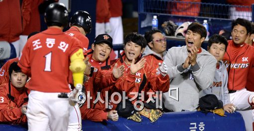 [아시아경제 김현민 기자] 프로야구 SK 와이번스와 두산 베어스의 경기가 16일 서울 잠실구장에서 열렸다. 연장 10회초 무사 2,3루에서 SK 조동화의 역전 1타점 우익수 희생플라이 때 3루주자 박계현이 득점에 성공하고 동료들의 환영을 받고 있다. 김현민 기자 kimhyun81@asiae.co.kr<ⓒ세계를 보는 창 경제를 보는 눈, 아시아경제(www.asiae.co.kr) 무단전재 배포금지>