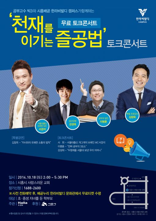 [아시아경제 조인경 기자] 한라(옛 한라건설)가 시흥시와 함께 18일 오후 2시부터 시민 2000여명을 대상으로 '천재를 이기는 즐공법(즐겁게 공부하는 방법)' 토크 콘서트를 개최한다. 시흥시 대야동 사랑스러운교회에서 열리는 이번 콘서트에서는 서울대 출신 개그맨 서경석 씨의 진행으로 성공적인 자녀교육에 대한 스타강사들의 조언이 이어지며 '금관악밴드'의 공연, 참가자 경품 추첨 등 다양한 프로그램으로 진행된다.소통전문가 김창옥 교수는 '자녀와의 소통의 법칙'을 주제로, 에듀플렉스 이병훈 부사장은 '진짜 공부의 3요소'에 대해, '공부의 신'의 저자 강성태 공신닷컴 대표는 '두 자녀를 서울대에 보낸 어머니'를 주제로 각각 강연에 나선다.참가를 원하는 시민은 사전에 전화로 예약(문의 1688-2600) 한 뒤 배곧누리 한라비발디 문화관에서 무료 티켓을 수령하면 된다. 이달 중 '시흥배곧 한라비발디 캠퍼스' 2701가구를 분양하는 한라는 '교육 신도시' 조성을 위해 지역 학부모들을 대상으로 다양한 교육특화 서비스를 선보일 계획이다.회사 관계자는 "이번 콘서트를 계기로 자녀 교육에 관심이 많은 학부모들이 배곧의 우수한 교육 여건에 관심을 갖고 많은 대화를 나누며 정보를 공유할 수 있는 유익한 자리가 되길 바란다"고 말했다.조인경 기자 ikjo@asiae.co.kr<ⓒ세계를 보는 창 경제를 보는 눈, 아시아경제(www.asiae.co.kr) 무단전재 배포금지>