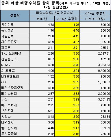 올해 예상 배당수익률 상위 종목(자료 에프엔가이드)